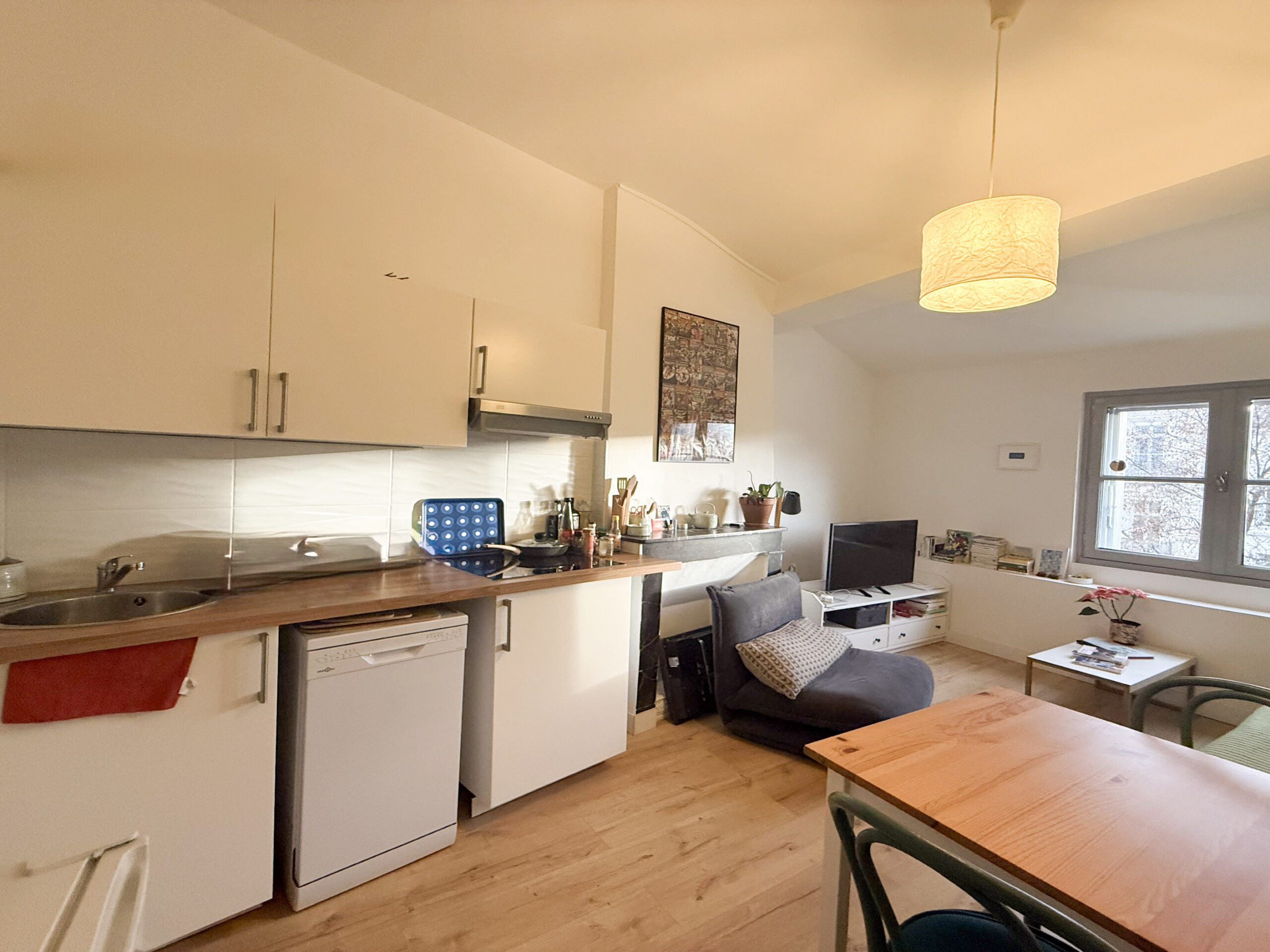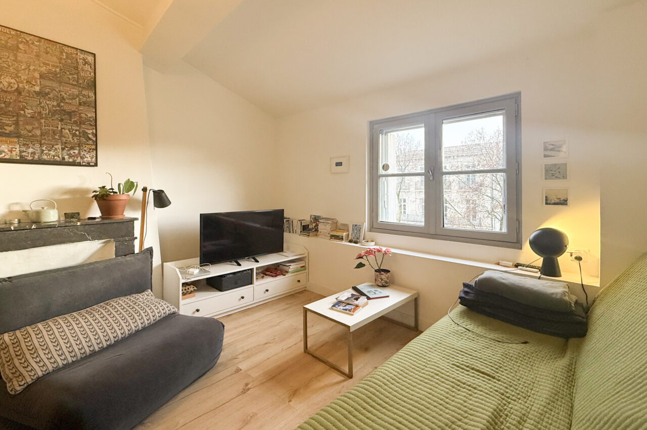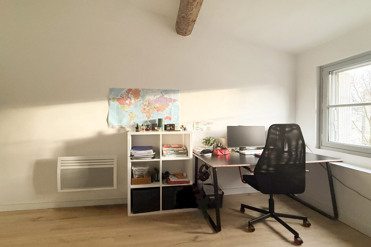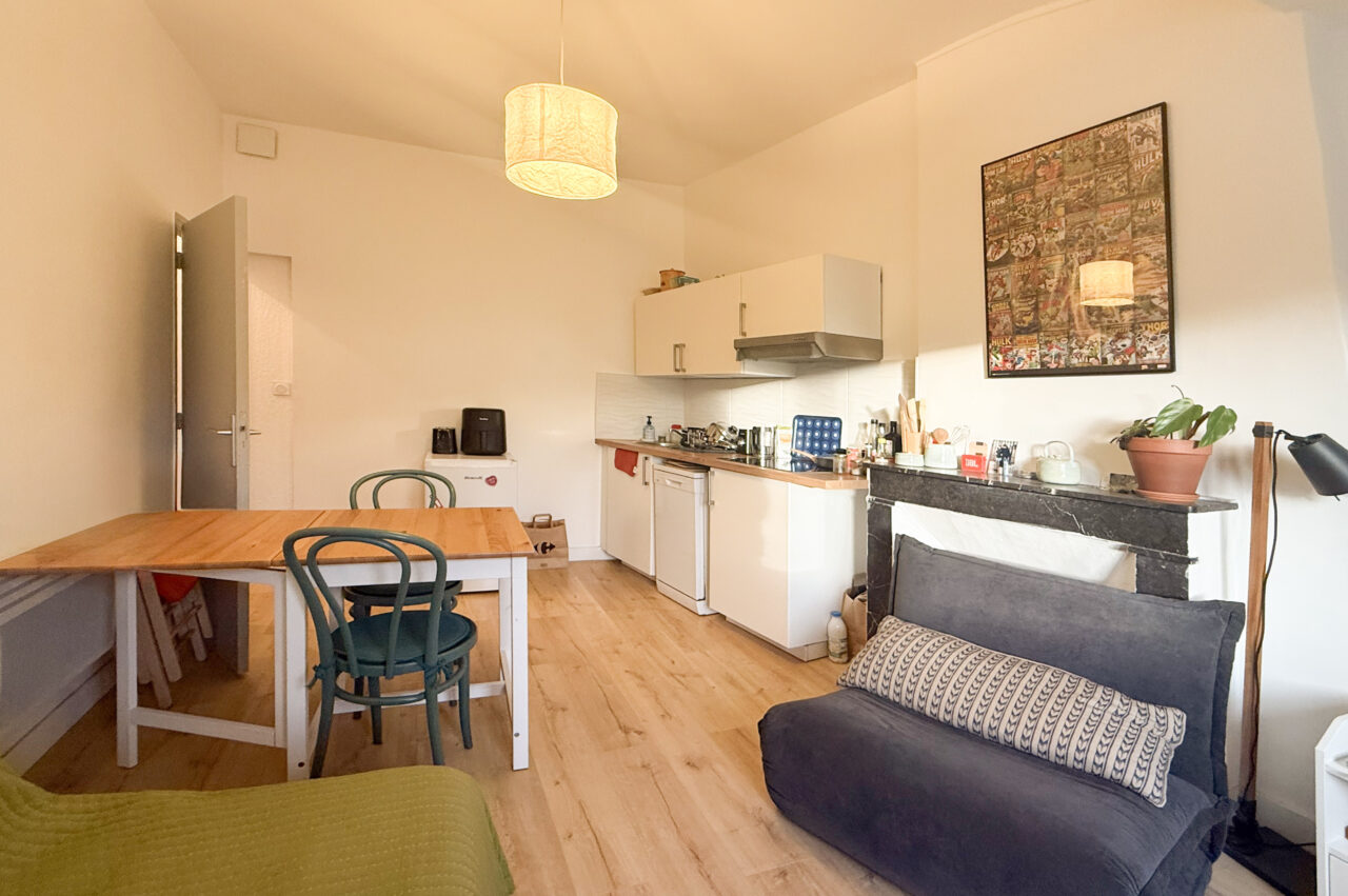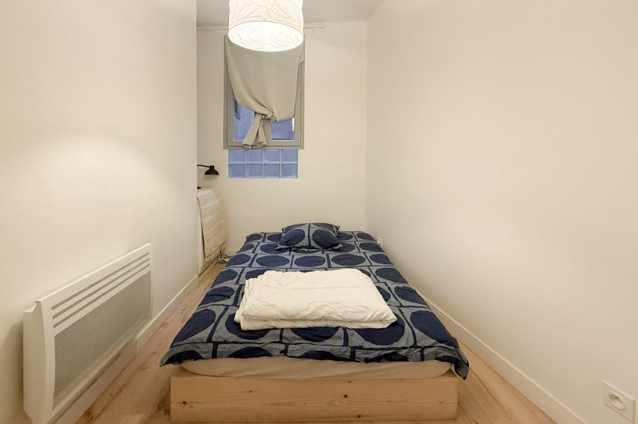 L’appartement, de 47 m², dispose d’un salon lumineux avec une cuisine ouverte entièrement équipée. Il comprend une première chambre spacieuse avec un grand placard mural ainsi qu’une deuxième chambre un peu plus petite pouvant faire office de chambre ou de bureau. Une salle d’eau et des WC séparés complètent le logement.
