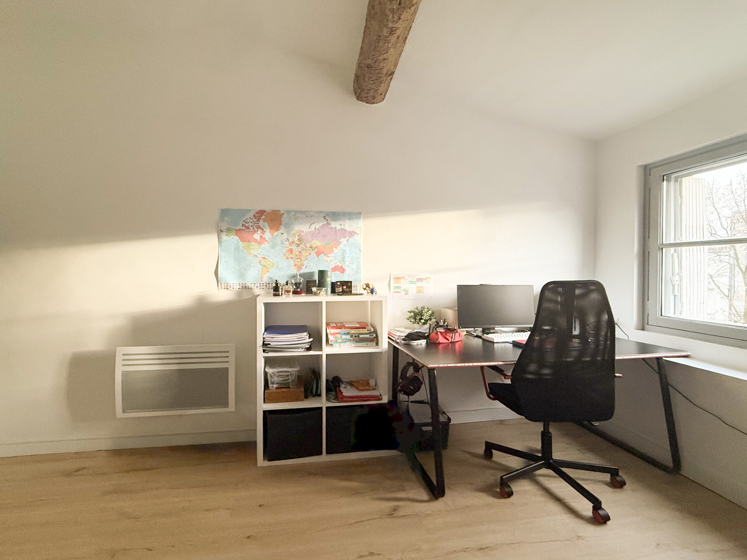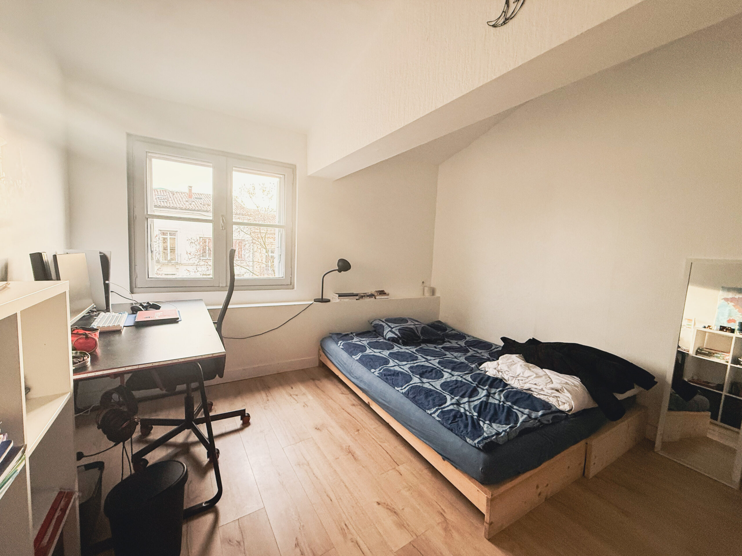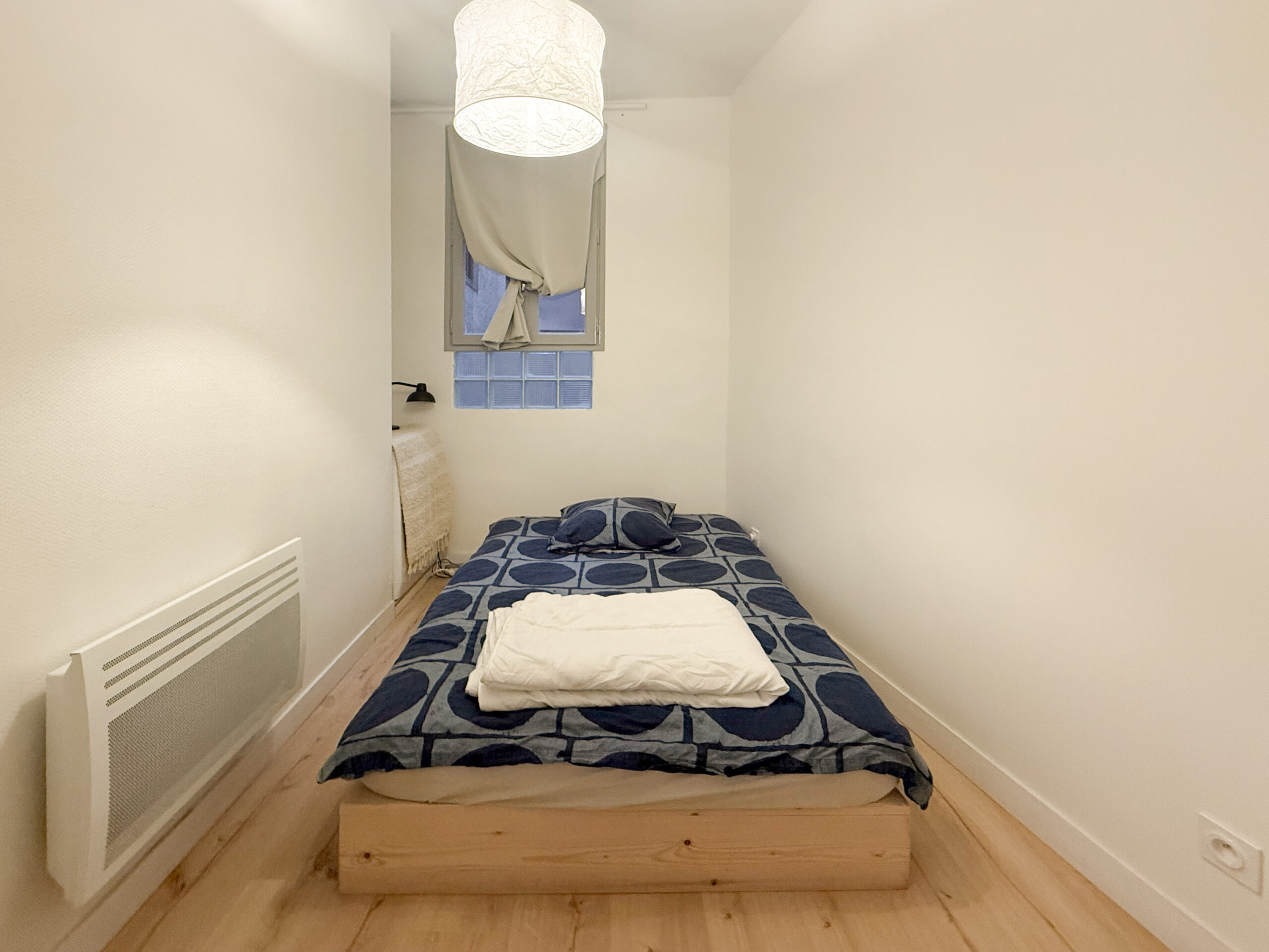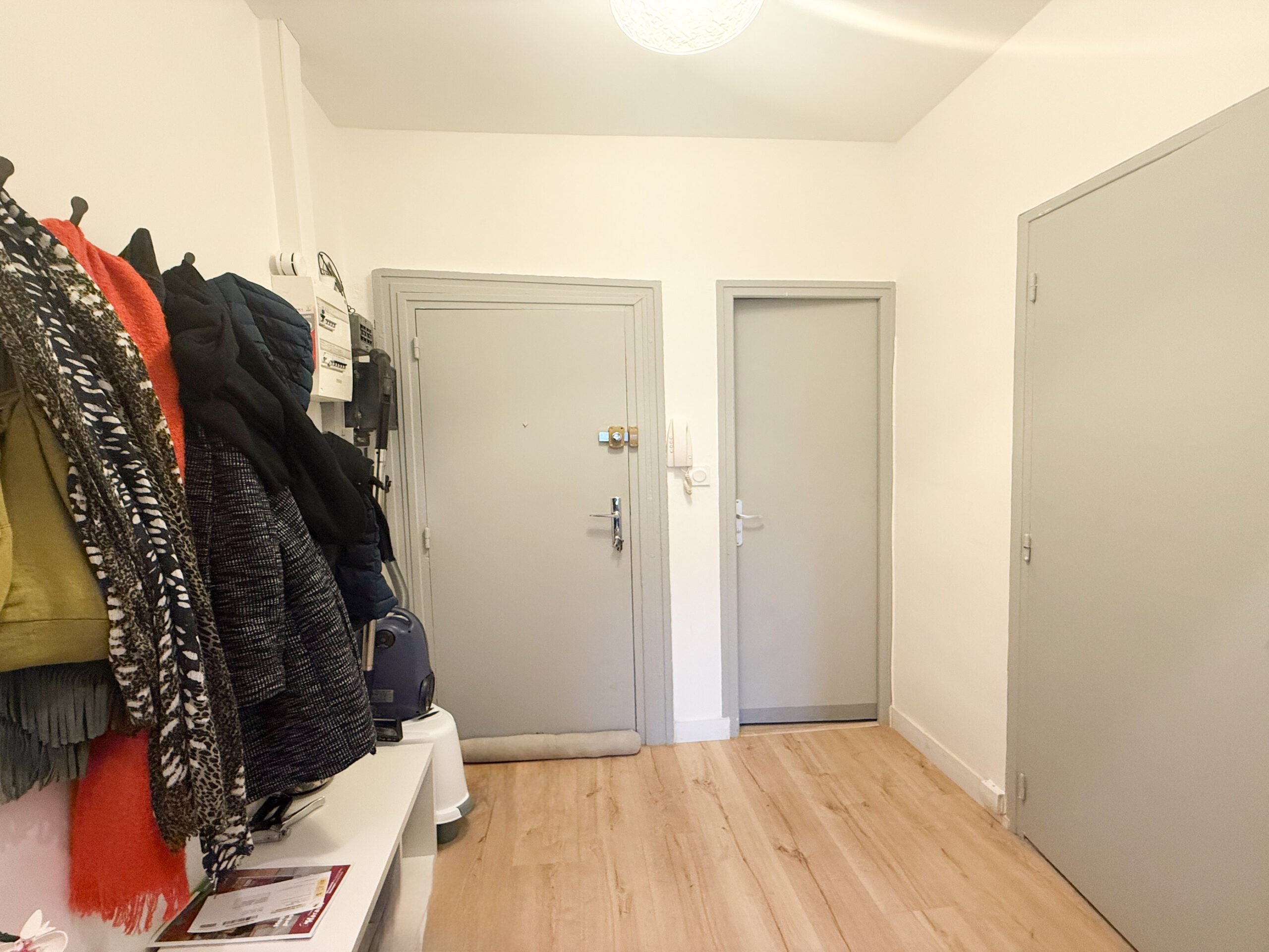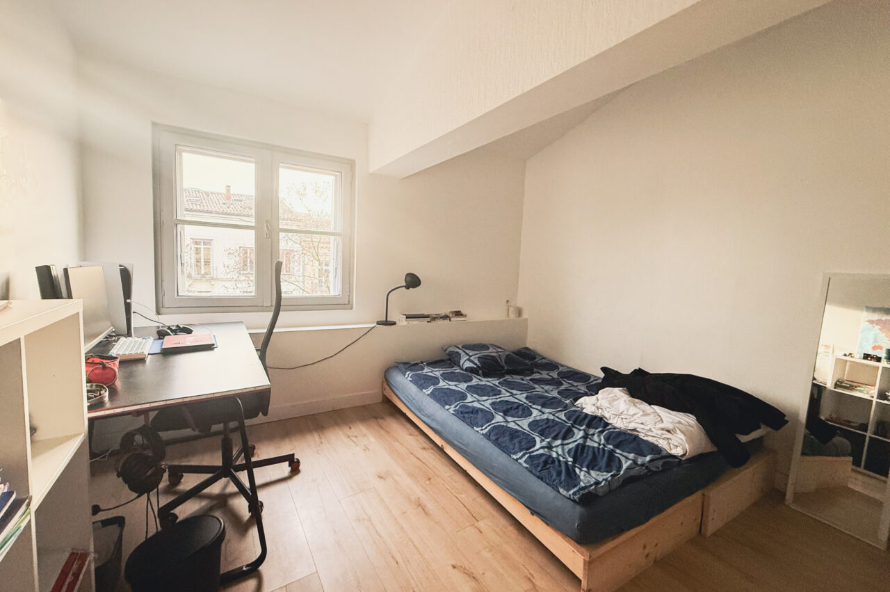 L’appartement, de 47 m², dispose d’un salon lumineux avec une cuisine ouverte entièrement équipée. Il comprend une première chambre spacieuse avec un grand placard mural ainsi qu’une deuxième chambre un peu plus petite pouvant faire office de chambre ou de bureau. Une salle d’eau et des WC séparés complètent le logement.